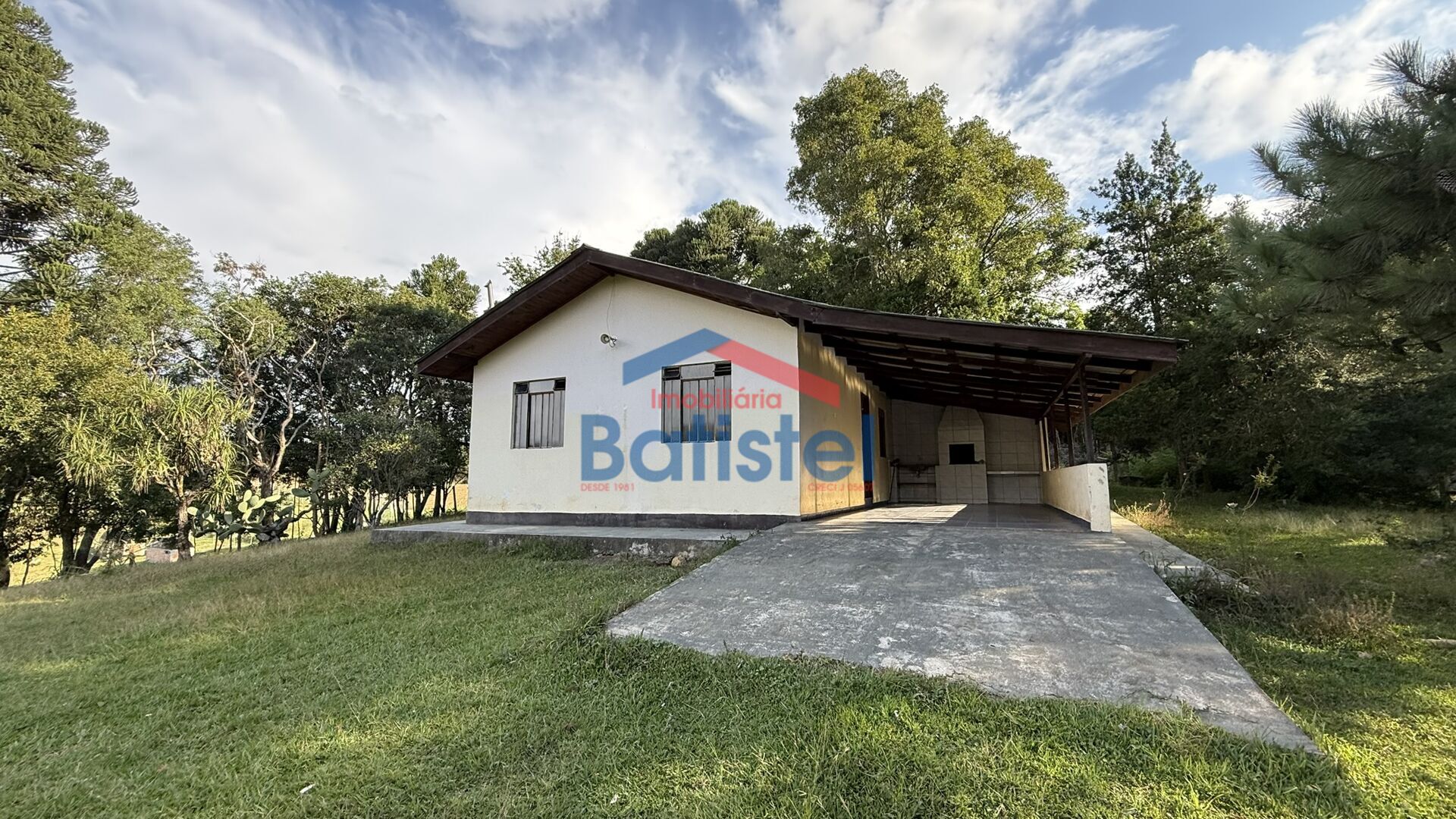 Casa em alvenaria com aproximadamente 90m² de área total, com 02 dormitórios, sala e cozinha, 01 banheiro social, garagem com churrasqueira e área de serviço.
